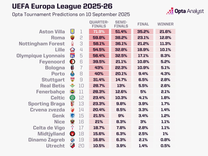 虎扑09月11日讯数据机构Opta发布本赛季欧联夺冠概率,其中阿斯顿维拉21.6%居首,罗马12.8%次席,诺丁汉森林11.3%排名第三。